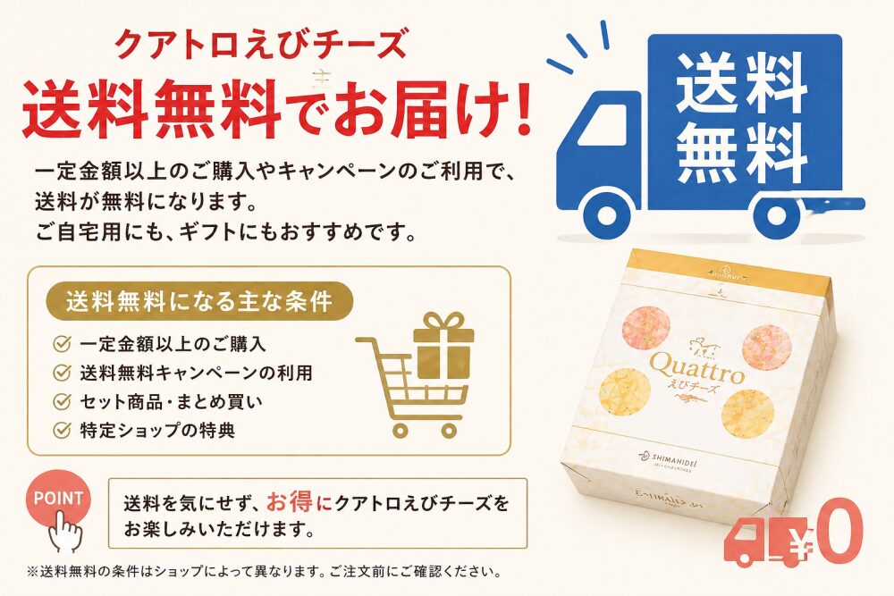 クアトロえびチーズを通販で買う場合、送料が無料になるかどうかは購入先やタイミングによって異なります。「絶対に送料無料で買える」とは言い切れませんが、条件を整えることで送料を抑えやすくなります。